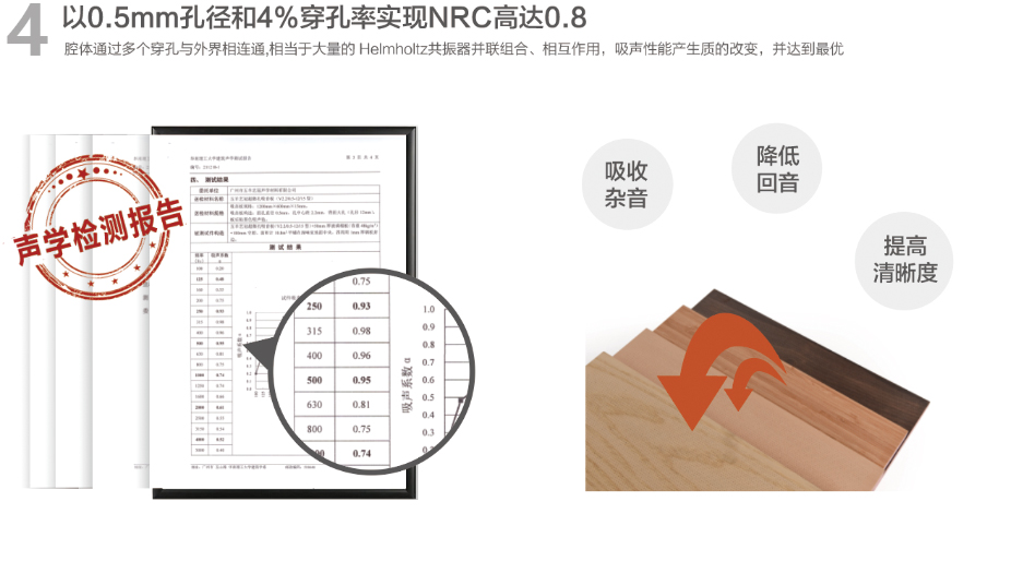 超微孔吸音板基于亥姆霍茲共振器原理,以0.5mm孔徑和4%穿孔率,實現(xiàn) NRC高達0.80、平均吸聲系數高達0.70,對中低頻吸聲效果尤佳,是裝飾和聲學功能完美結合的產品。