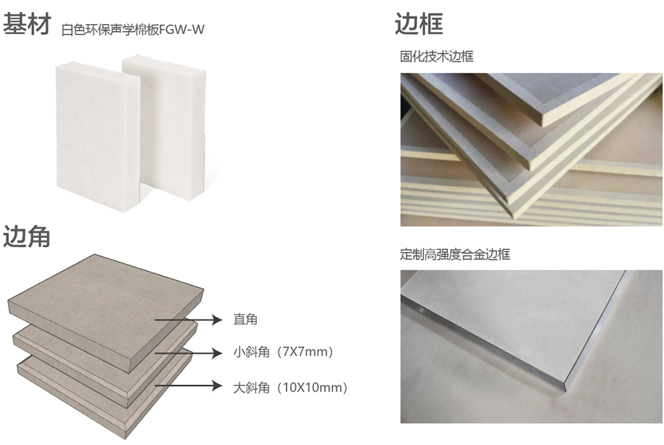 無醛布藝吸音板內置高密度白色環保聲學棉板,結構穩定,健康、安全、對人體友好;典型的多孔吸聲材料,全頻吸聲,用于墻板、天花板等可大量吸收房間內的聲能,降低混響時間、減少室內噪聲。 外包可選擇阻燃聲學布、A級防火玻纖布等,多品類、多顏色及多圖案,也接受客戶提供飾面材料;可定制固化技術邊框和高強度合金邊框結構,防火、環保、防潮及抗變形性能更優。