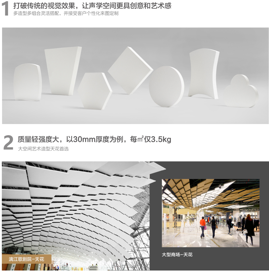 藝術空間吸聲體是一種以高強度玻纖聲學棉為主要材料,擁有多樣化造型和顏色的一種現代天花懸吊裝飾材料。非常適用于具有藝術設計造型安裝需求的空間。它在滿足聲學需求的同時,也實現了空間的靈動和設計感。你可以單獨或者分組安裝,創建你自己的獨特設計。