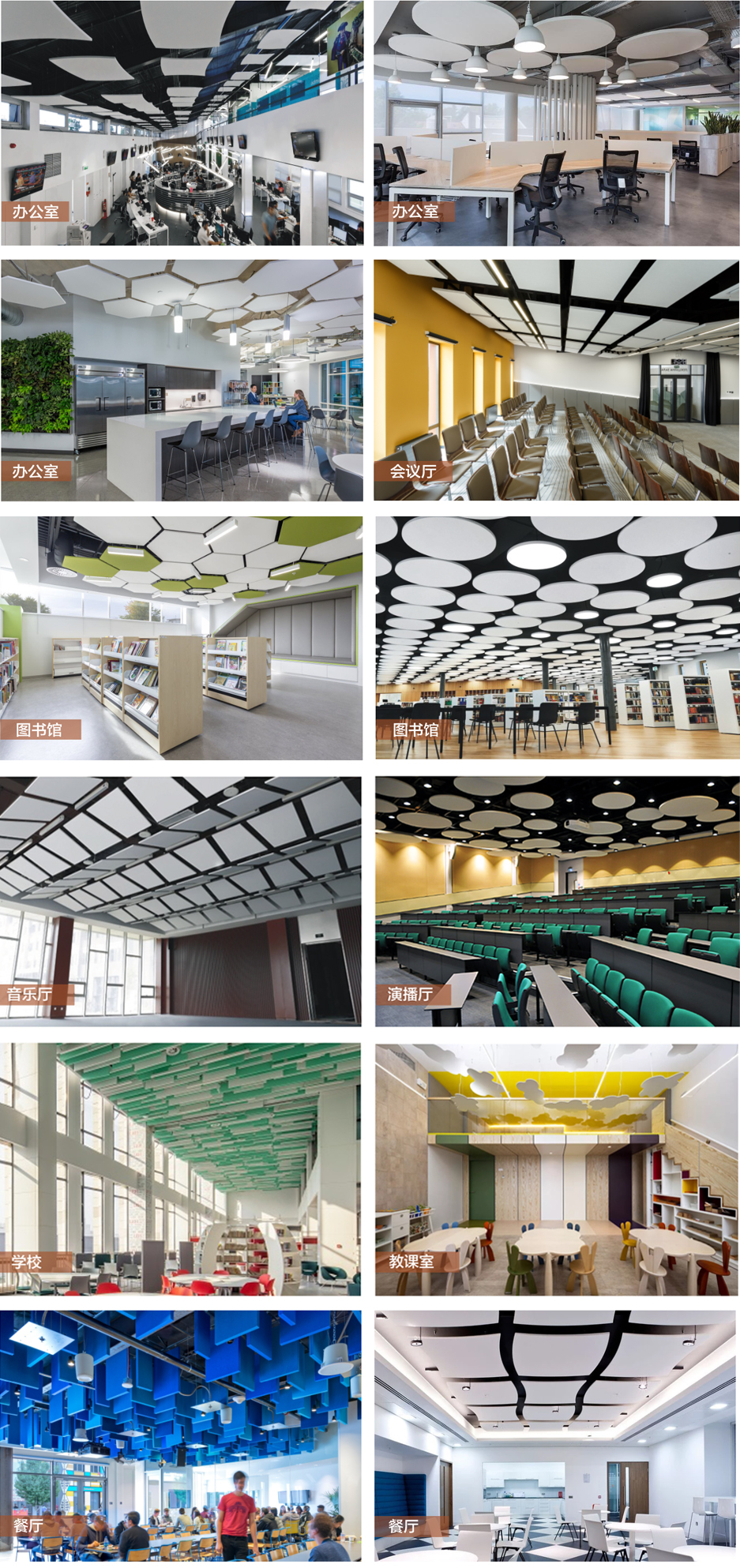 酒店、辦公室、醫院、圖書館、影院、劇場、音樂廳、體育館、演播廳、會議室、車站候車廳和機場等。