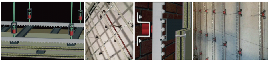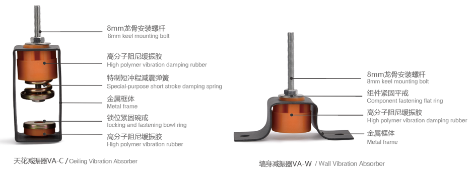 天花減振器和墻面減振器采用高分子阻尼緩振膠,100%原生膠鑄造,耐老化時(shí)間及阻尼系數(shù)是翻新膠件的五倍以上,從硬件的品質(zhì)上保證了隔聲效果永久性和安全性。天花減振器是剪切吊頂天花與原基礎(chǔ)樓層天花結(jié)構(gòu)傳聲的有效途徑。墻面減振器適用于墻身增強(qiáng)隔聲結(jié)構(gòu)層安裝固定,在聲波照射面與原基礎(chǔ)墻體間形成隔斷層。