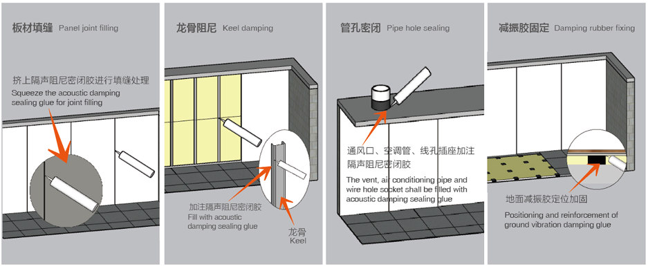 天花、墻體和地面的隔聲結構交合處需要作軟接觸處理,不能做硬接觸。縫隙填充是隔聲處理的最后一道工序,也是最為重要的一環。