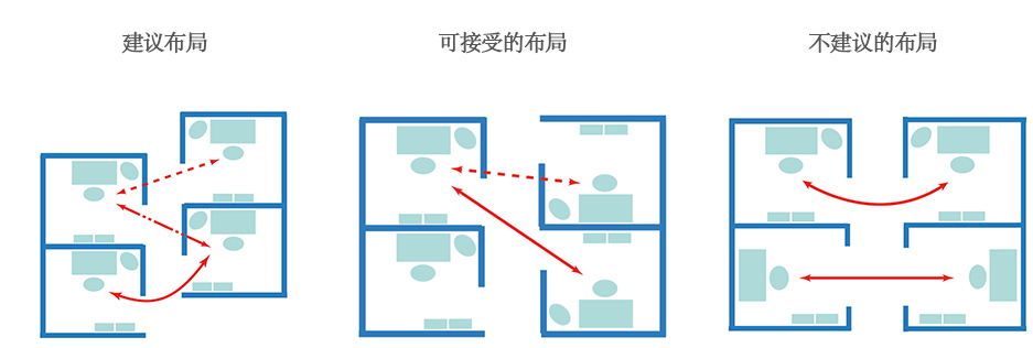 不同工作組之間使用隔斷分割,工位不能直接對望,出入口宜錯開,錯開角度越大聲學效果越好。