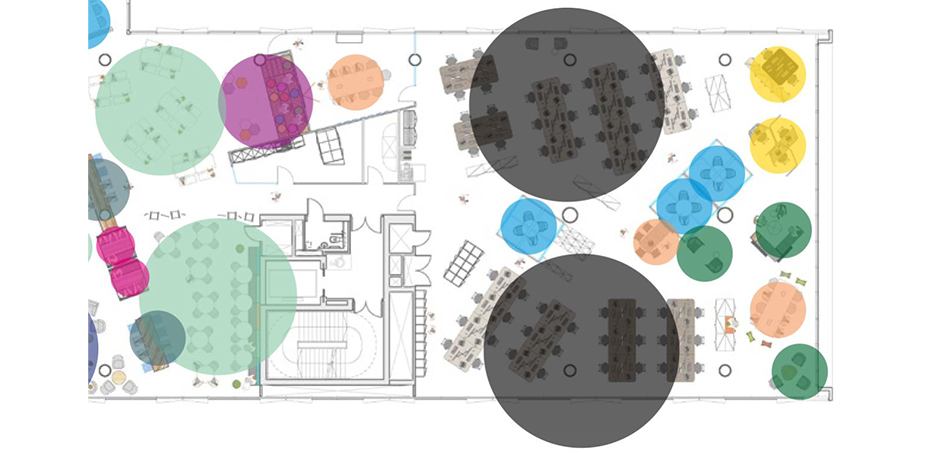1、活躍度高的區域應該集中布置在周邊地區,四周界面用強吸聲材料處理,盡量遠離專注區/機密區,朝向較安靜區(如休息區)一側設聲屏障,可在中間設走道以加大間距。