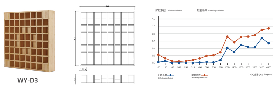 木質擴散體是一種不規則的平面設計,目的是在反射中產生擴散,它產生的聲音非常豐富而圓潤,混響聲似乎是從許多方向從側向、從頭頂以及從前方到達聽眾的,可顯著地改善廳堂的音質條件。