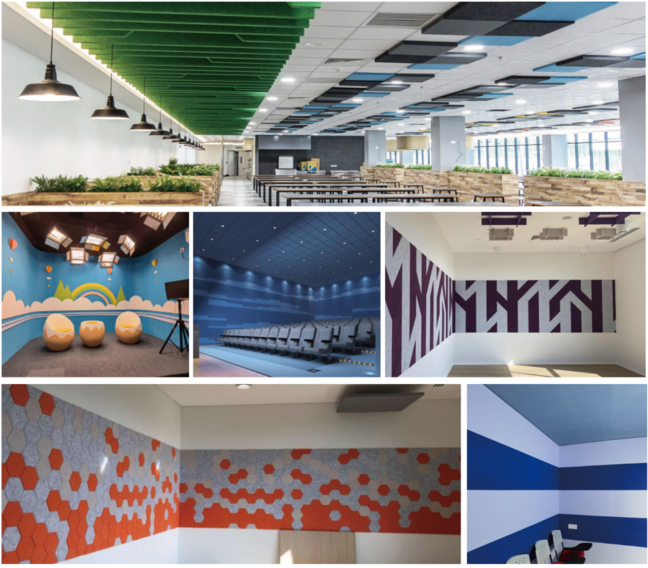 聚酯纖維吸聲板是由100%聚酯纖維為原材料,經(jīng)過熱壓合成繭棉狀。孔隙率達(dá)到90%以上,在中高頻率具有良好的吸聲效果。聚酯纖維吸聲板具有高密度、環(huán)保、阻燃、施工簡單、容易切割、無粉塵等性能,飾面顏色多樣,很好滿足客戶多樣化的需求以及裝飾效果。