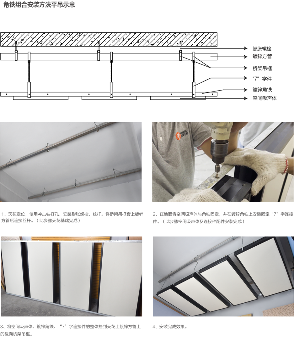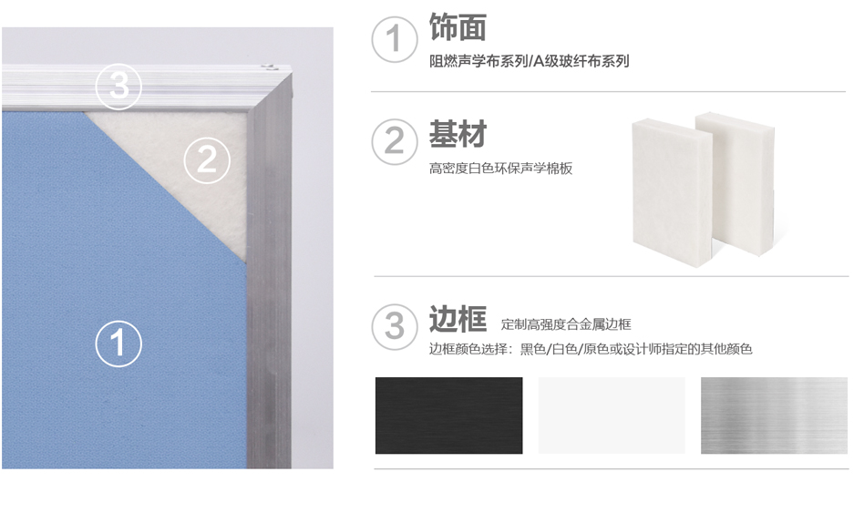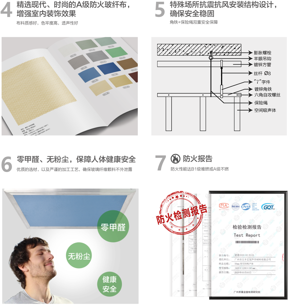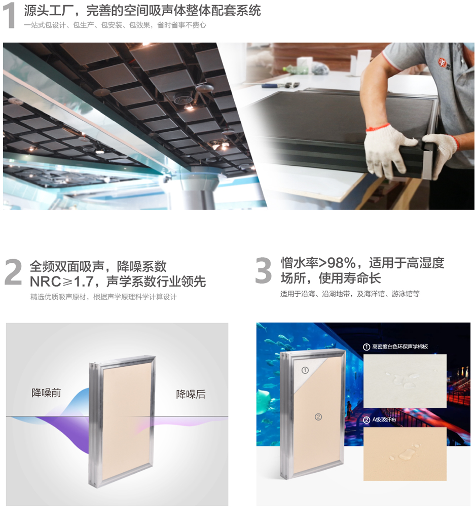 體育場館、演藝廳、多功能會議廳等建筑,為了達到建聲設計要求,需要使用空間吸聲體。空間吸聲體是一種懸掛在頂部具有強吸聲效率的聲學材料,水平或者垂直懸吊,全頻雙面吸聲,中高頻吸聲效果尤佳。 SA-A50E內置50mm白色環保聲學棉板,零甲醛、無粉塵,健康安全對人體友好,更佳的環保效果;因白棉具有強憎水性,使其抵制水汽的能力更強,擁有更長的使用壽命。